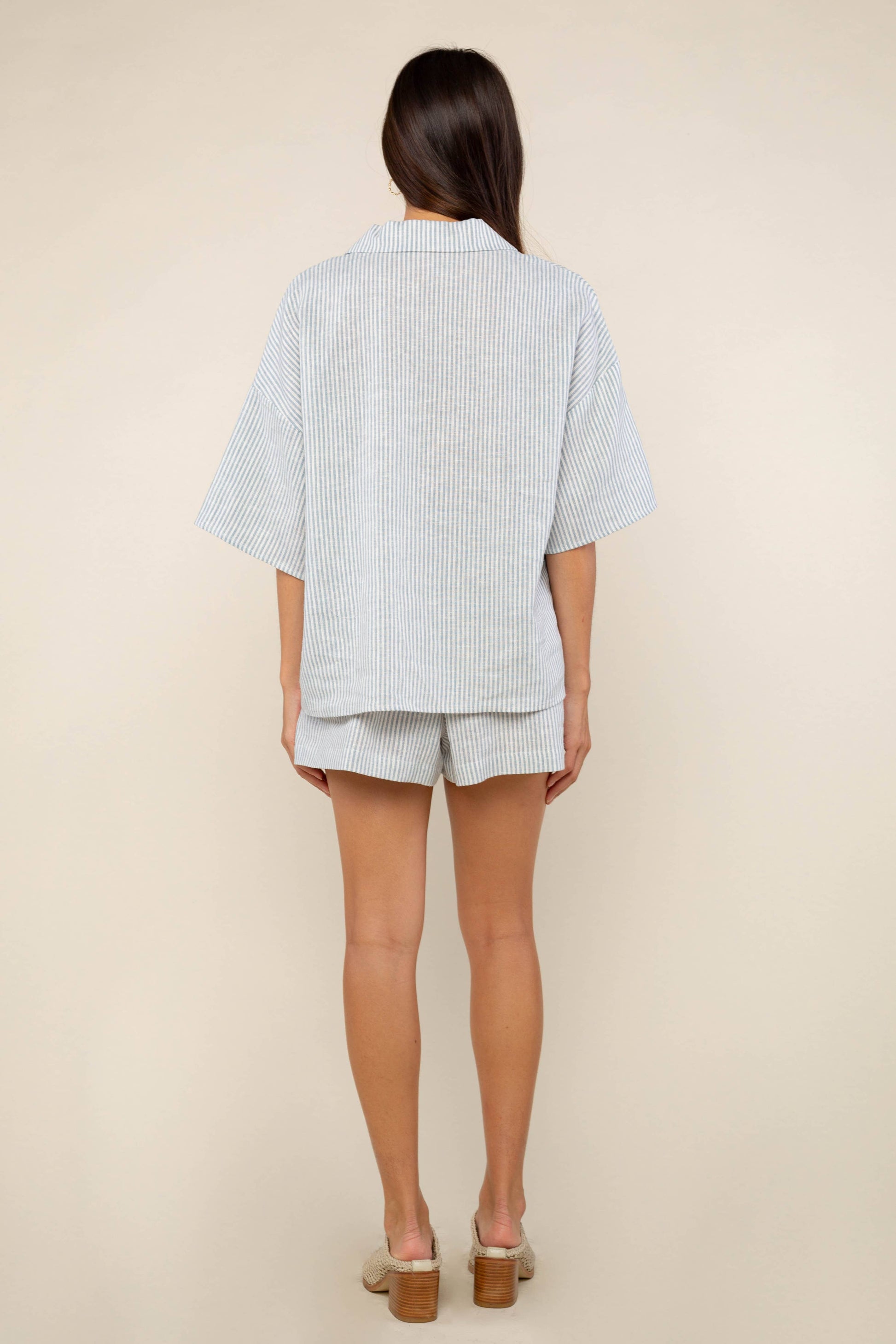 Introduce a touch of minimalist aesthetic to your everyday wardrobe with our Kerry Stripe Shorts from NLT. These vertical stripe shorts come with a tie at the front, offering a chic, comfortable fit for plus size. Crafted from a blend of 55% linen and 45% viscose, they promise a soft and breathable wear. For care, simply hand wash them. Proudly designed, cut, sewn, and produced under one roof in Los Angeles, these shorts reflect our commitment to conscious manufacturing. Step into comfort and style with NLT.